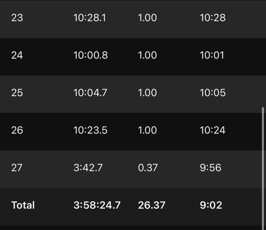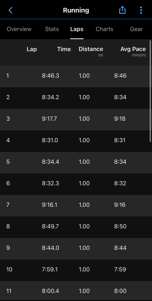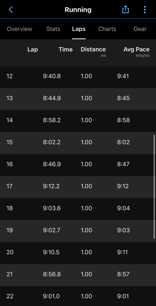 By mile 22 I had changed my stance. I went from “oh yeah, this sucks but I’ll definitely still finish” to “Oh my God I’m definitely not going to finish” and “what decisions did I make to have led me to this moment and how can I avoid this in the future.” I slowed way down but I was still in motion. For context, here are my splits for the first 22 miles: