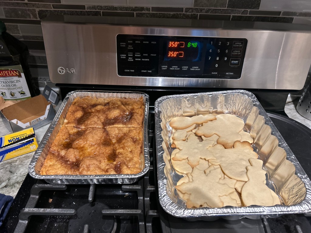 To finish off the year before we and our friends head off to our families for the holidays, we hosted a late Friendsgiving/Christmas party. I made a vegan chickpea and rice “casserole,” and Jason made chicken parm. For dessert, I made Christmas sugar cookies to decorate, and Jason made “Sopapilla cheesecake” (pictured below). He said he found the recipe on a pillsbury can when he was 12 🙂