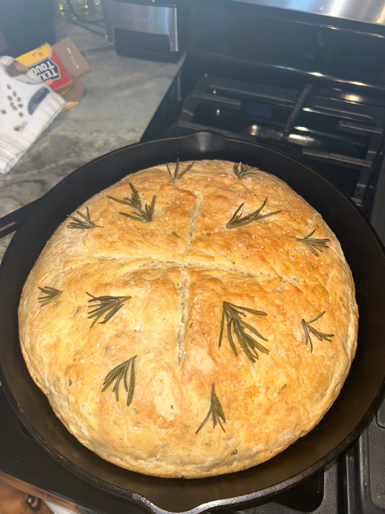 I used a super easy skillet bread recipe that took only about 2 hours from start to finish. I haven’t tried it yet because I’m so proud of how it turned out and I don’t want to cut into it 🙂 but it smells delish so I’ll probably have to sometime later today…
